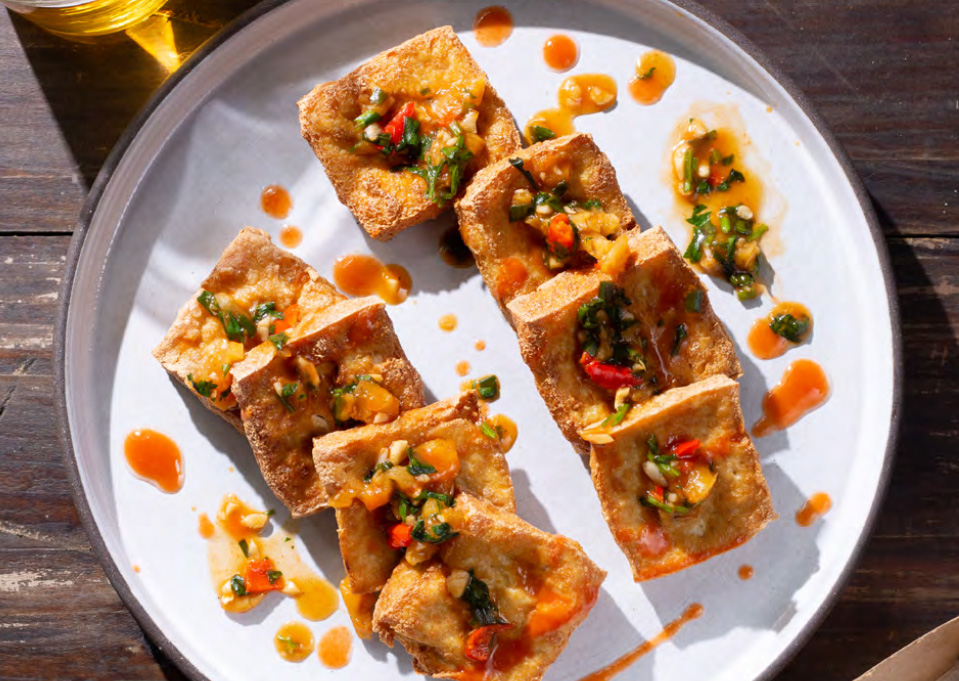 再加入剩余酱汁食材一起混合后淋在炸好的豆腐上即可摆盘享用