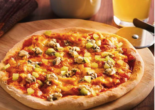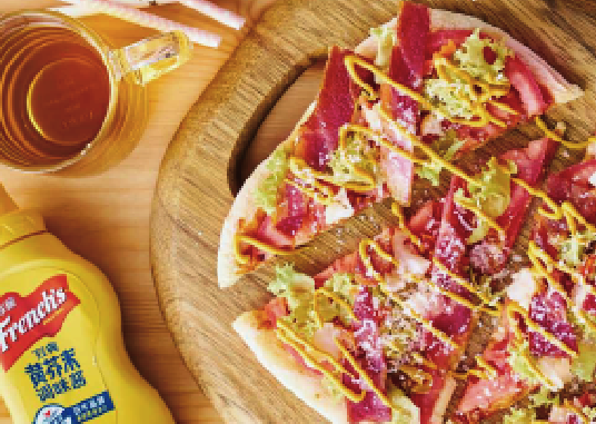 1. 烤箱预热至190摄氏度。将味好美番茄沙司涂抹在披萨饼底上,边缘留出1厘米宽。 2. 撒上美国芝士条,并铺满马苏里拉奶酪丝,再在上面撒上熟碎牛肉,送入烤箱烘烤8~10分钟,直至芝士融化、饼皮香脆。 3. 取出披萨,撒上培根、生菜、西红柿和莳萝泡菜点缀,淋上纷乐旗经典黄芥末调味酱,将披萨切分6块食用即可。